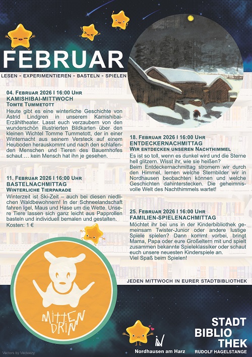 Im Februar gibt es bei MITTENDRIN – dem Kinderprogramm der Stadtbibliothek wieder ein bunt gemischtes Angebot: Beim Kamishibai -Vorlesenachmittag freuen wir uns dieses Mal auf eine winterliche Wichtelgeschichte, und am Bastelnachmittag geht es ab in den Schnee – auf Skiern. Kleine Forscher können bei unserem Entdeckernachmittag den Sternenhimmel kennenlernen, und für die Spielbegeisterten unter euch haben wir einen Familien-Spielenachmittag auf dem Programm.