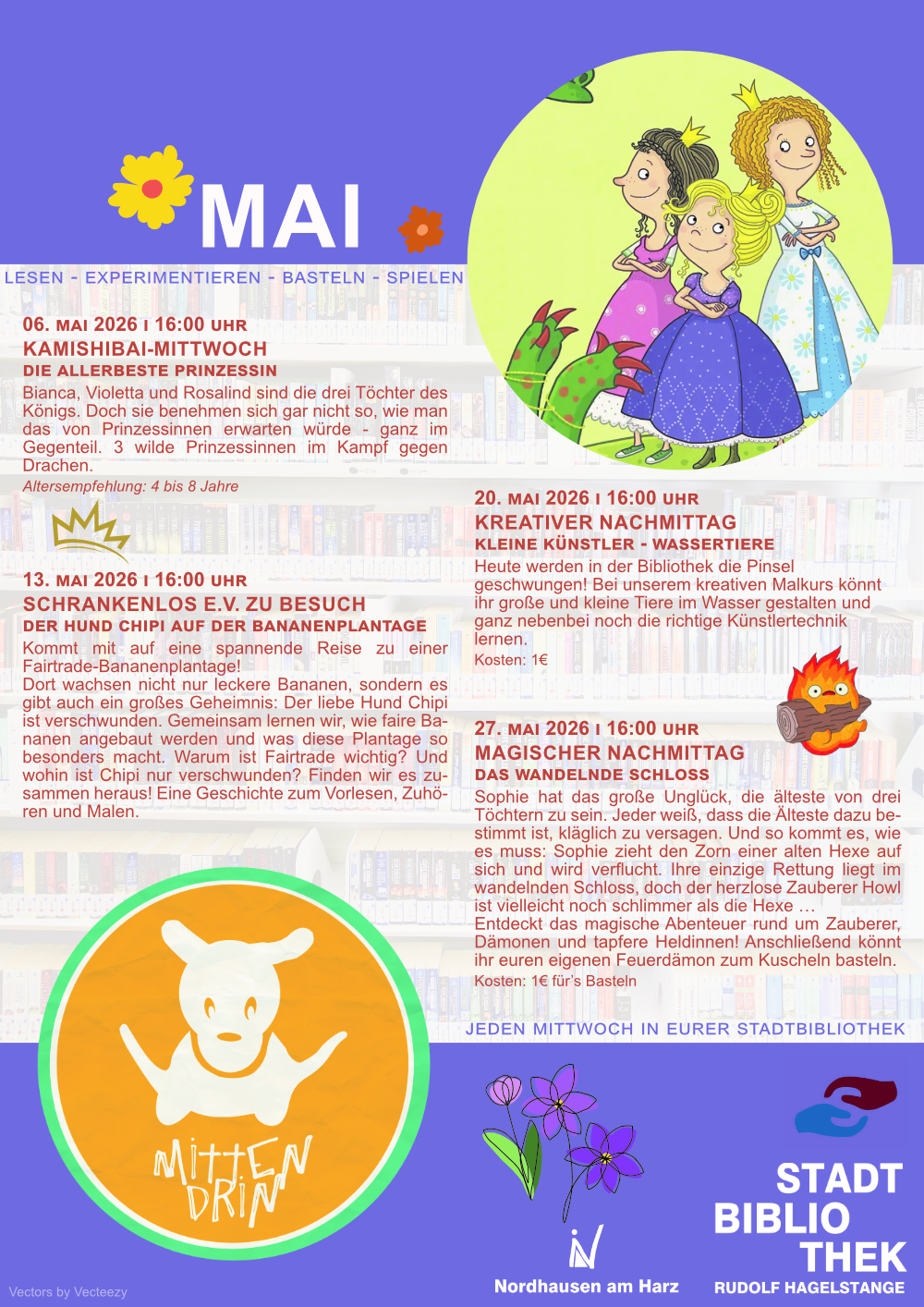 Im Mai wird in der Kinderbibliothek vorgelesen, gemalt, gebastelt und am magischen Nachmittag wird es zauberhaft!!! Außerdem kommt uns der Verein Schrankenlos besuchen und ihr könnt beim Malen einer spannenden Geschichte über Hund Chipi lauschen.