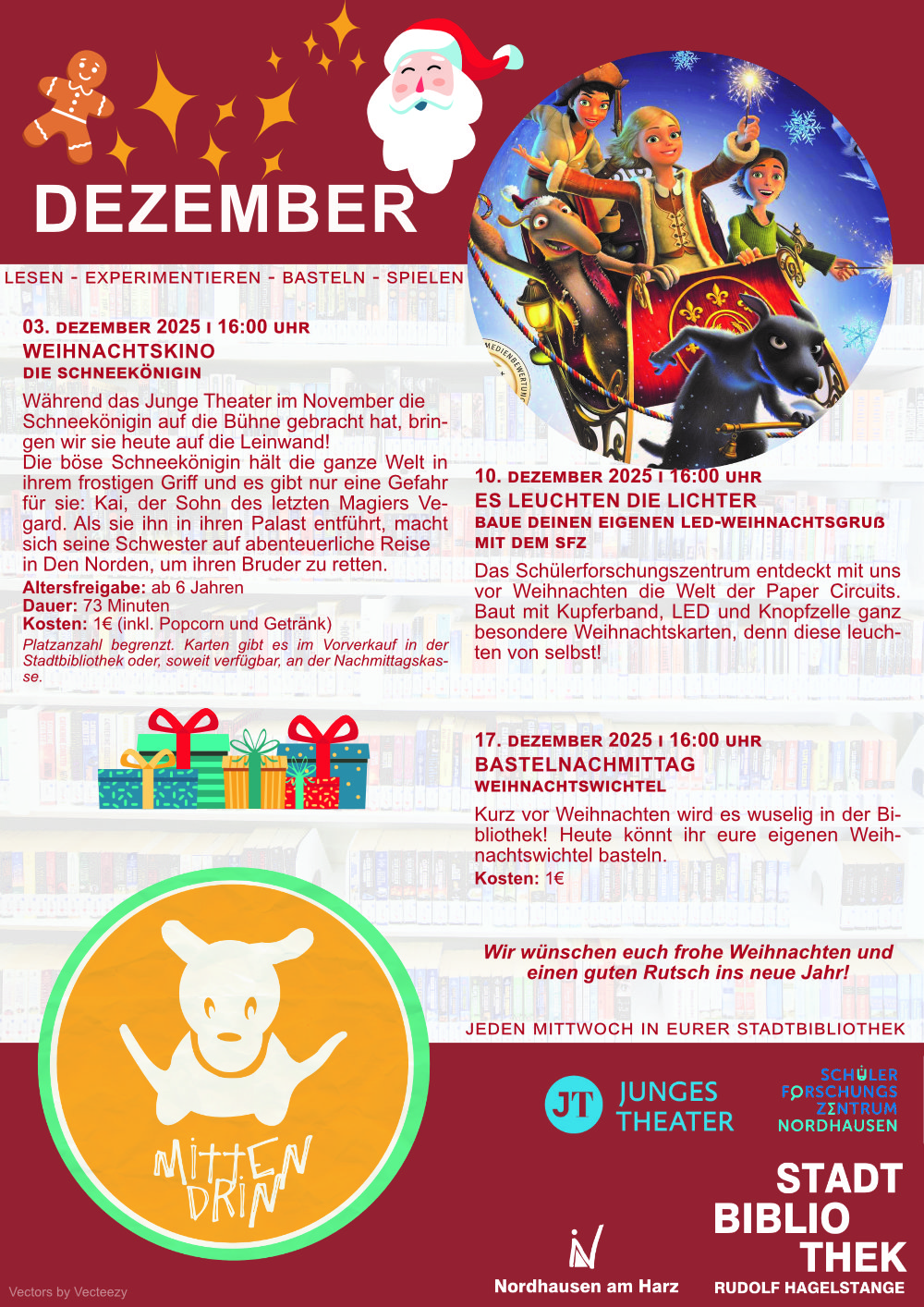Die Adventszeit steht an und auch wir sind natürlich in Weihnachtsstimmung. Deshalb könnt ihr euch im Dezember auf unser Weihnachtskino und echten Wichtelzauber freuen. Außerdem kriegen wir weihnachtlichen Besuch vom Schülerforschungszentrum und verbinden Kreativität und Technik! Da vergeht die Zeit bis Heiligabend wie im Flug!